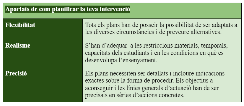 A l'hora de planificar la seva intervenció (orientar i dirigir el procés d'ensenyament-aprenentatge), el professorat ha de realitzar un esquema de treball i una programació específica per competències, objectius, unitats didàctiques i temes. Clarament, per organitzar aquesta planificació s'han de tenir en compte diversos aspectes, que segons Valverde (1990) són aquests: